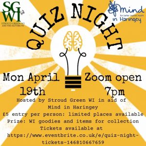 The wonderful Stroud Green WI are hosting a very special Zoom Quiz night on Monday 19th April at 7pm, raising money for us at Mind in Haringey! There are excellent prizes up for grabs and limited places, so click here to sign up!