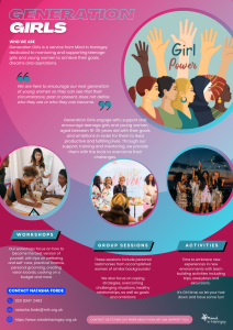 Generation Girls engage with, support and encourage young women, aged between 16-25 years old with their goals and ambitions in order for them to lead productive and fulfilling lives. Through our support, training and mentoring, we provide them with the tools to overcome their challenges and help them with signposting to other support organisations to improve mental health and wellbeing.